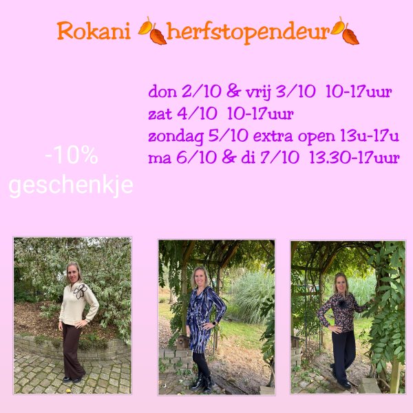Rokani is een damesboetiek gelegen te Pijpelheide. Ons assortiment kleding begint vanaf 34 en gaat tot 52 in sommige merken.